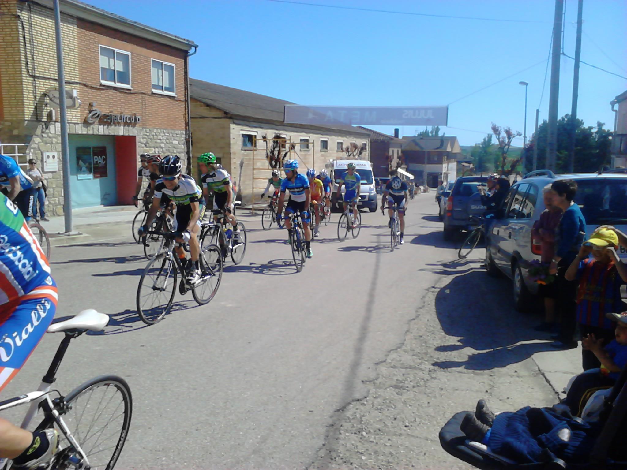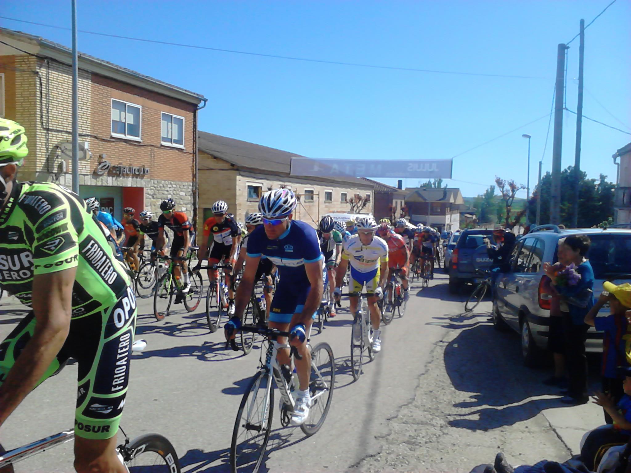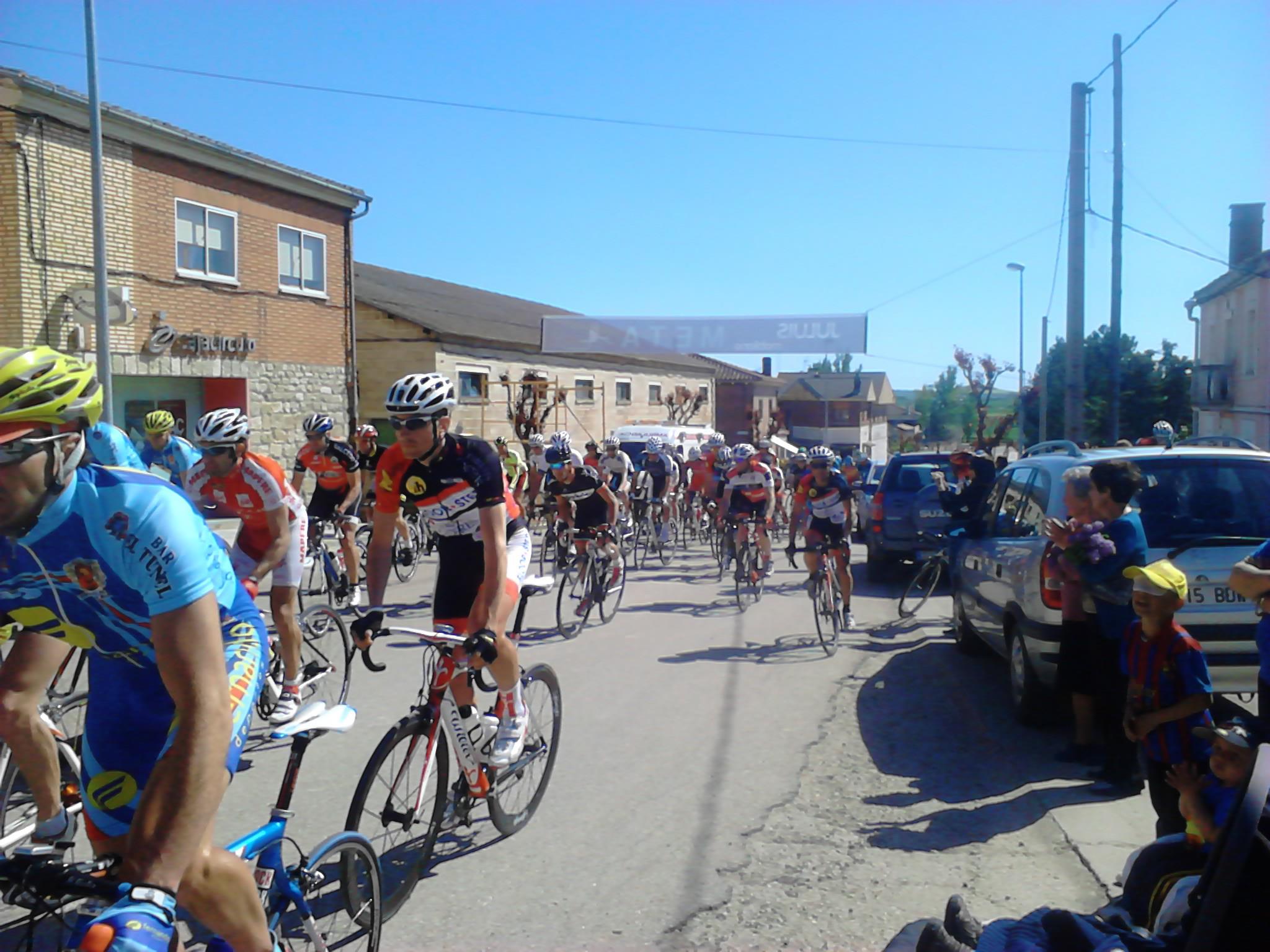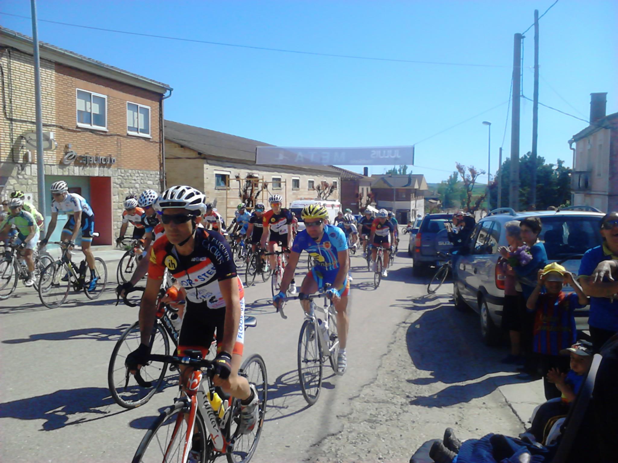 Giramos casi 180º y entramos en una carretera con asfalto del que se agarra y no permite rodar cómodo, aún cuando se vaya a rueda. El pelotón sigue rodando compacto y la velocidad hace que no se produzcan apenas intentos de fuga, o que estos sean neutralizados rápidamente. Yo lo intento en alguna ocasión, pero los corredores del Deportes Fernando me tienen vigilado (sin comerlo ni beberlo me vi en segunda posición en la clasificación de la Copa) . Así pasamos por primera vez por la meta.