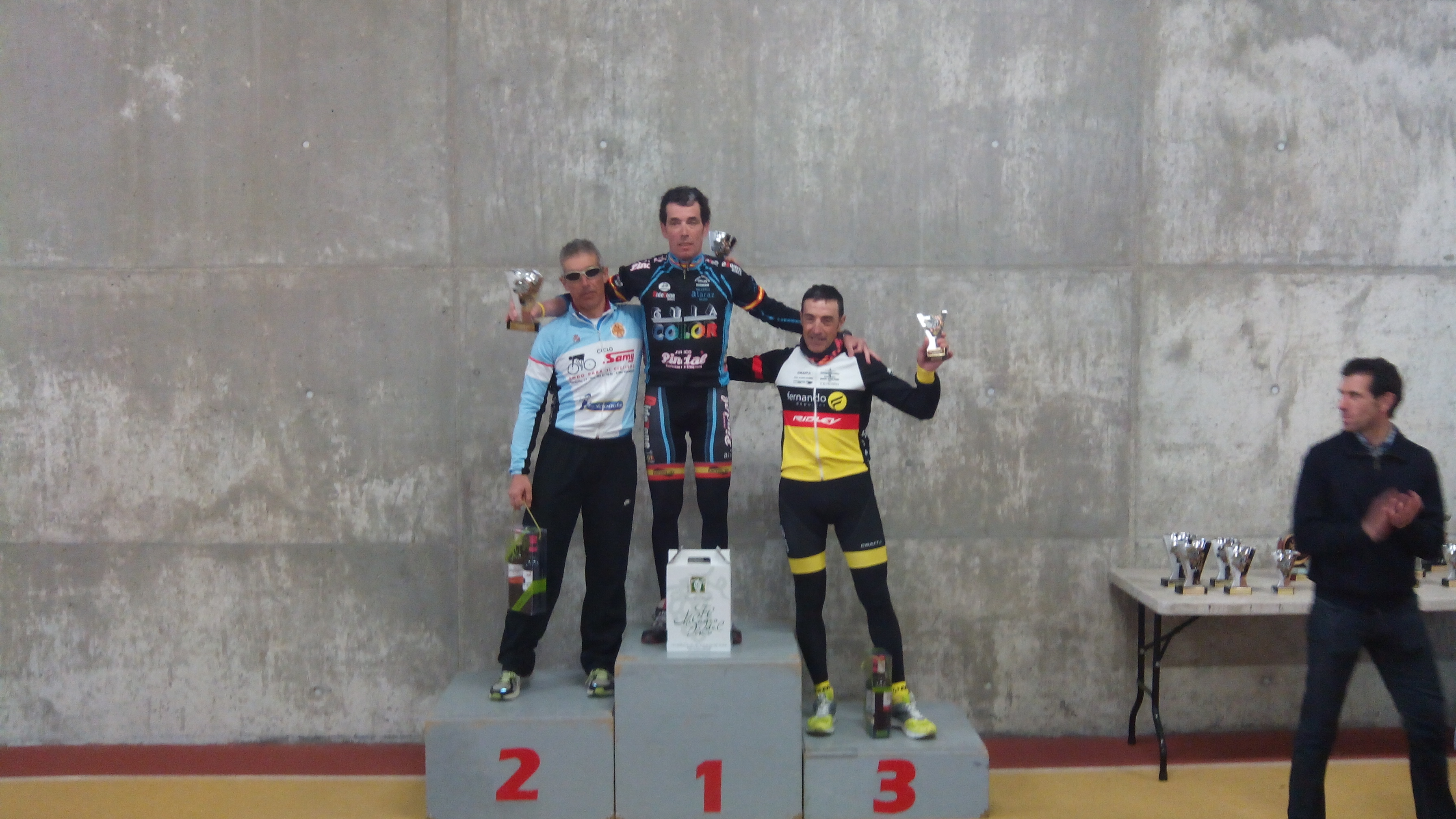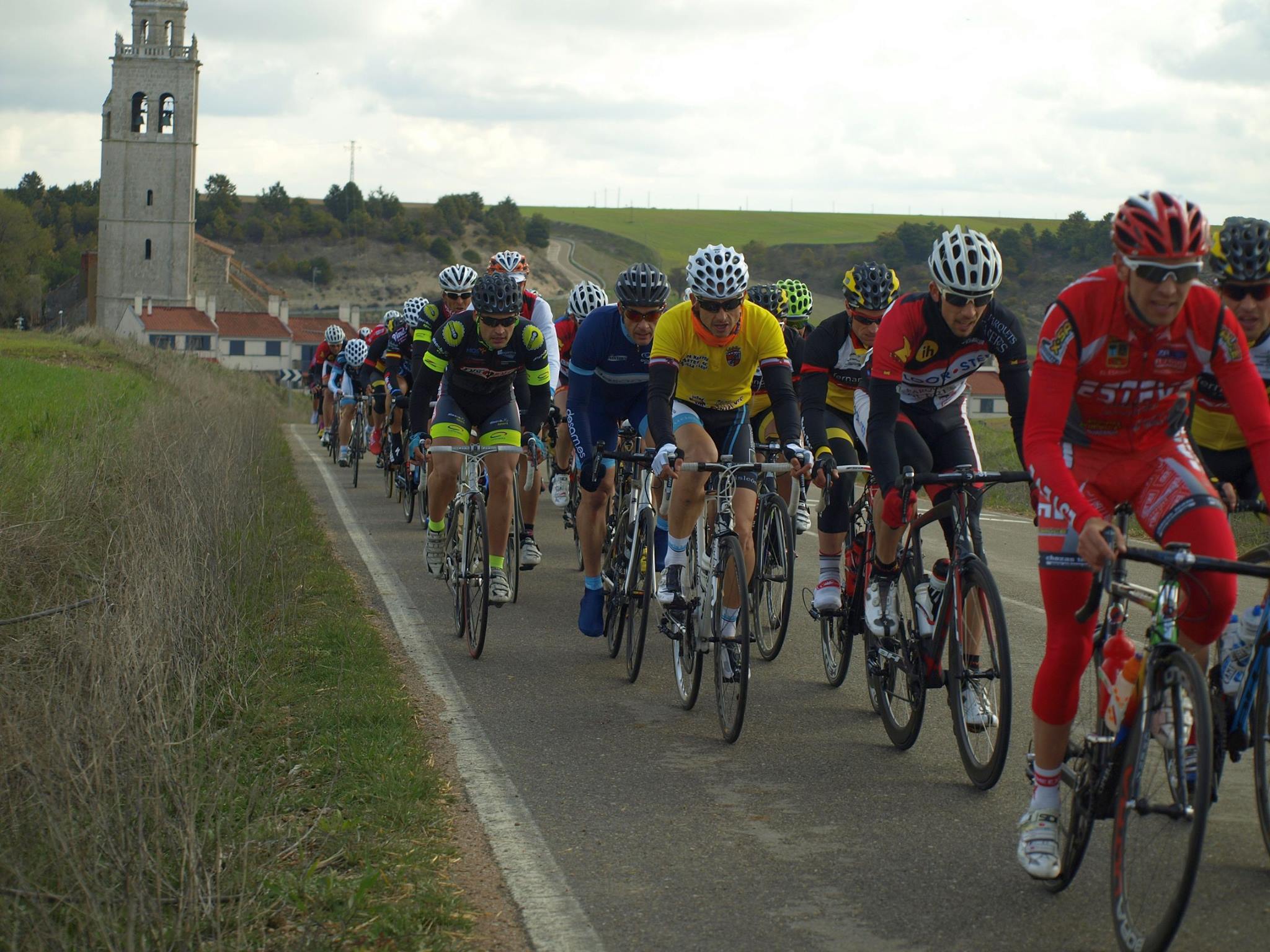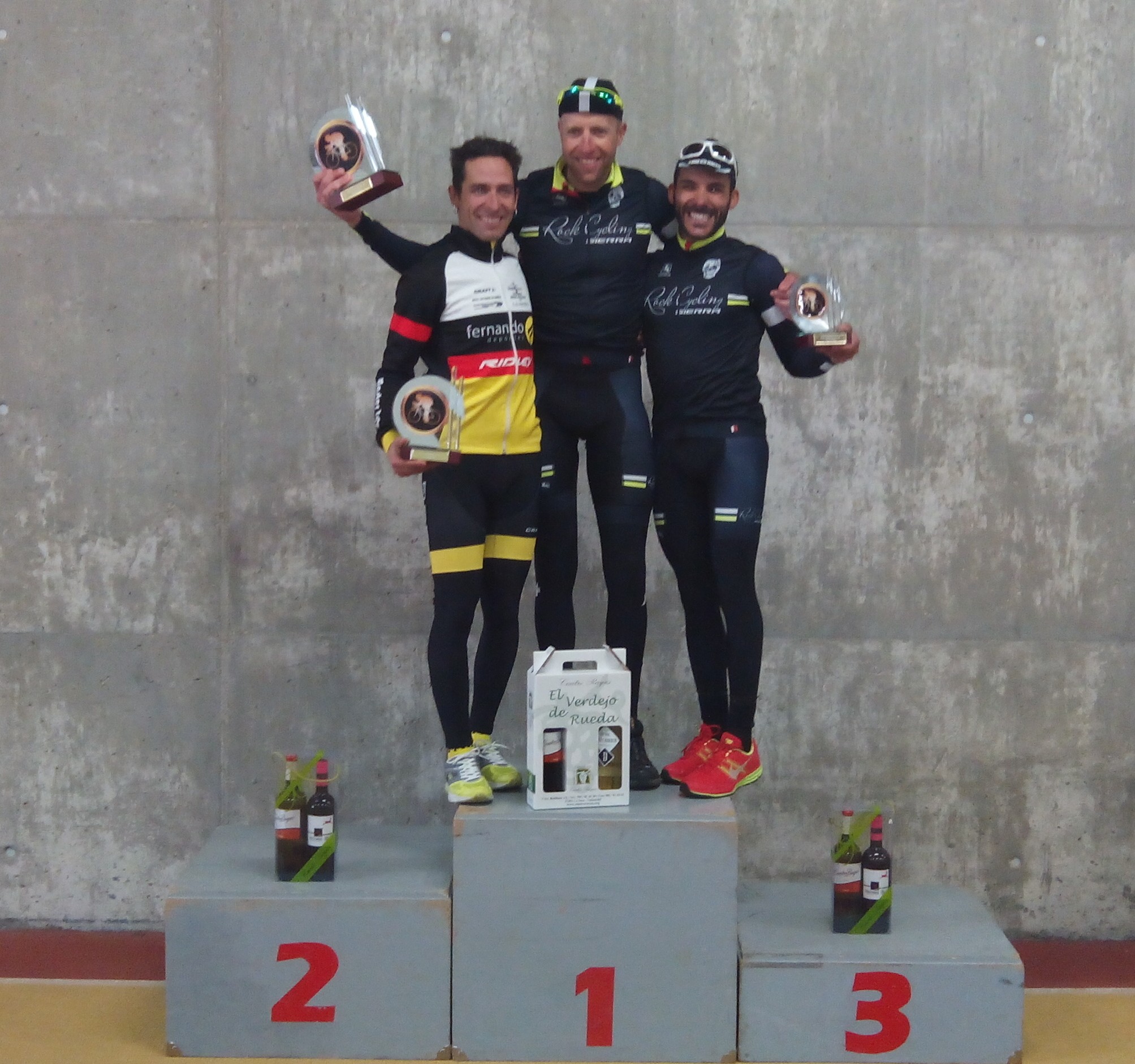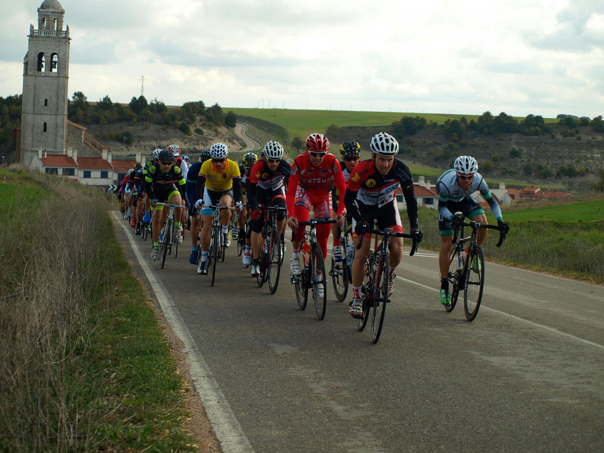 Mientras tanto, en la cabeza de carrera Jesús Merino trataba de seleccionar el grupo o puntuar para la clasificación de la montaña, o ambas cosas a la vez, en la subida de Wamba, localidad que debe su nombre a un rey visigodo y cuyo nombre se pronuncia con ‘B’, no digáis «guanba» por favor. El viento en el páramo no permitía alegrías, así que Merino volvió al redil. La jugada buena fue la que tenía preparada un hábil Turégano. El madrileño atacó en la rotonda que da entrada a Sotoverde y, mientras sus compañeros que quedaban mirando unos a otros, a ver quien le ponía el cascabel al gato, Turégano bajó piñones y puso la directa hasta la pancarta de meta, que cruzó en solitario. Por detrás Miguelín (Deportes Fernando), parece querer ganarse a pulso el título de Poulidor en la categoría máster y repetía segundo puesto.
